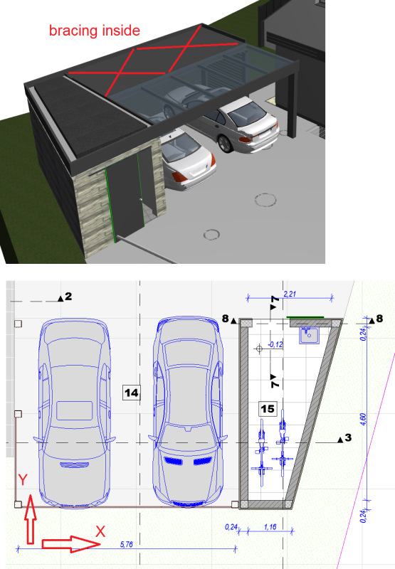 in Y direction there is a bracing in roof plane that is fixed to masonry building (concrete ties) so the forces are transfered to masonry building