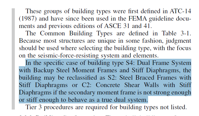 Using AISC 41, I am conducting a Tier 1 seismic analysis of an existing hospital building that has previously undergone a seismic retrofit. The original building (1947) used steel moment frames. The retrofit (1981) used concentric braced frames. I am trying to pick the building type for the current analysis. S1 Steel Moment Frames can't be right, it's undergone a retrofit. S2 Braced Frames could be correct, although I don't know if the retrofit was intended to replace the moment frames or augment them, and it seems as though it would be conservative to neglect the moment frames. However, the description of S4 Dual Systems with Backup Moment Frames is very close to the building I have. I know this is ultimately a judgment call based on the best guess for how the building will behave, but as this is my first interaction with AISC 41 any thoughts would be helpful. Thanks in advance.
