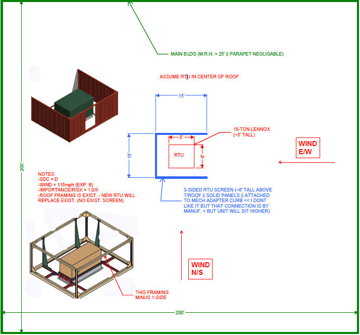 For the sake of time I'm inclined to just design for a standalone wall (rooftop equip/structure/appurt.) and double it for reactions at base of the RTU, even though 150% still sounds conservative. I'm looking for loads on my framing/curb holddown - not the screen design. This is obviously overkill but quite frankly "sake of time - not money" is a client-based prerogative. Don't worry...i'm off the clock.