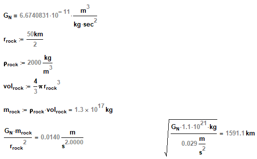 To help you solve this problem, the density of rocky asteroids is about 2000 kg per cubic meter, and the volume of a sphere is 4/3*pi*Rad^3.