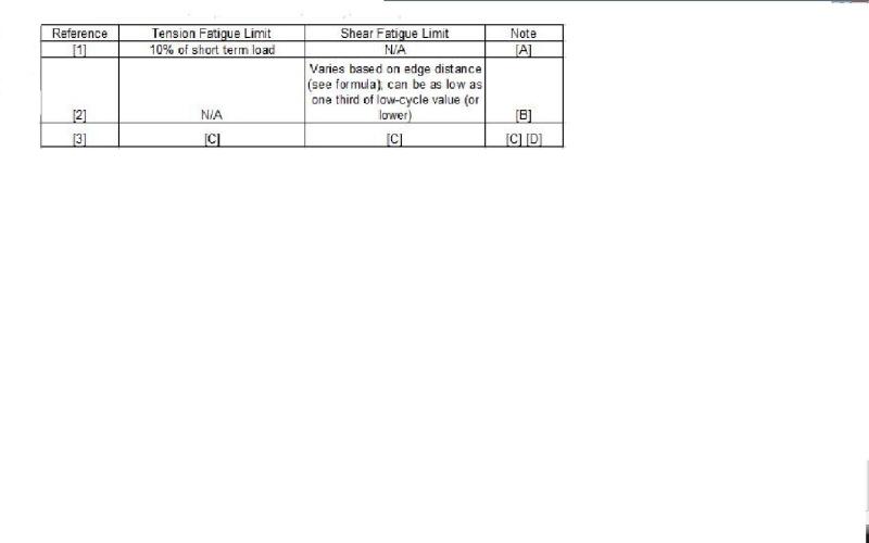 [C] In this reference it says (in the uncracked concrete section): “It is therefore to be expected that the fatigue strength associated with concrete cone failure is at least equal to the fatigue strength of concrete subjected to uni-axial tension. This premise was confirmed in tests with single headed studs and groups with four studs.....” This would mean it would be analogous to tensile failure in ACI 215R-74. (The latest addition I have.) ACI 215 has several charts that deal with fatigue strength in tension.
