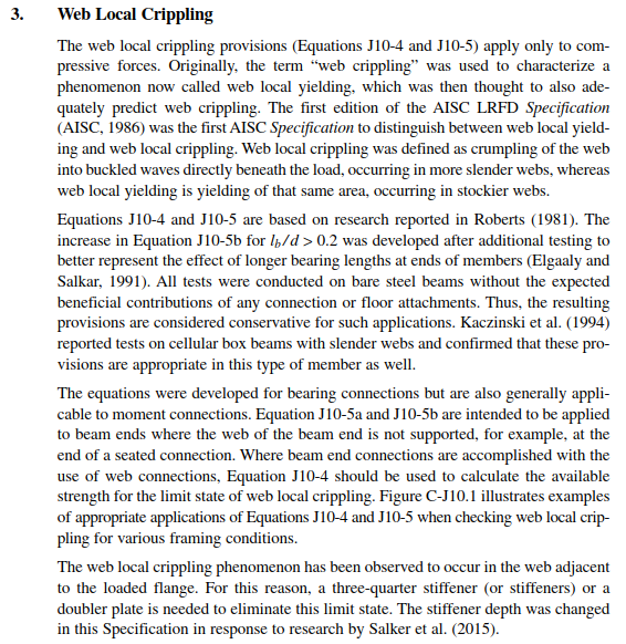 2.) I question this. Although the equations seem to indicate that the entire height is involved in the capacity, according to the AISC commentary the buckling only occurs in a portion of the web directly adjacent to the loaded edge. So part of me says "the height should not affect web crippling based on what my eyes see", but the other part of me says "this is probably a higher mode of buckling which is still dependent on the total height".