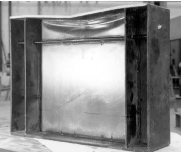 Interesting. What I take from that is that the 0.20 - 0.25 high longitudinal stiffeners commonly provided to address shear buckling and flexural compression web buckling don't extend low enough to do much about crippling. So, again, it all comes back to how tall that buckled chunk of web is. The photo below is from the Rockey paper. Looking at that, I'd have a pretty tough time accepting that suitably located longitudinal stiffeners wouldn't help. As shown in the picture, they would reduce the height of the buckling. I'd think that capacity would go up in proportion to the squared inverse of that reduction.