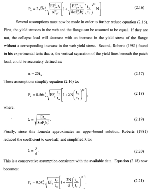 KootK - Great references, thanks for sharing. The longitudinal stiffeners in the Elgaaly and Salkar tests actually were placed near the top flange (loaded flange) at distance of 0.2d, while the crippling occurred within a height of 0.16d. But your point stands, and I agree that a well-placed longitudinal stiffener (25tw from the loaded flange?) would have to increase the crippling capacity. Also agree that for OP's condition the two vertical stiffeners alone seem the most practical. I thought this bit from your second reference was interesting on how bf was removed and d was inserted into the crippling equations: