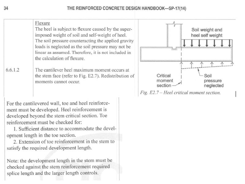 Below is an excerpt from ACI's Concrete Design Handbook showing the critical section for the heel. The CRSI Retaining wall design guide has a similar discussion about development length of heel bars.