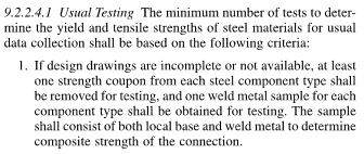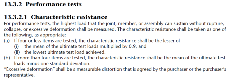I'm helping a client come up with bending capacities for a new curtain wall system split vertical mullion. It's sketchy stuff so I'm recommending some testing. I'll have to come up with a testing program though and that's currently where I'm stuck. I would have thought that there would be a standard out there for testing structural things. You know, this many tests if you want to be at this confidence level. Does anybody know of such a standard? Or is time to bust out stats for engineers and go first principles on it? The blurb below comes from Canada's aluminum standard.