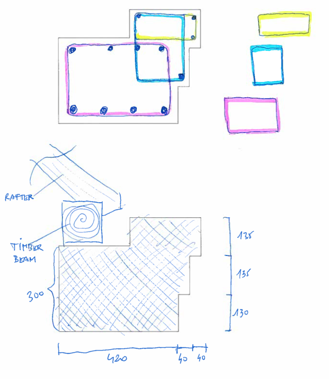 Beam is on top of columns and it supports timber beam + rafters (roof).