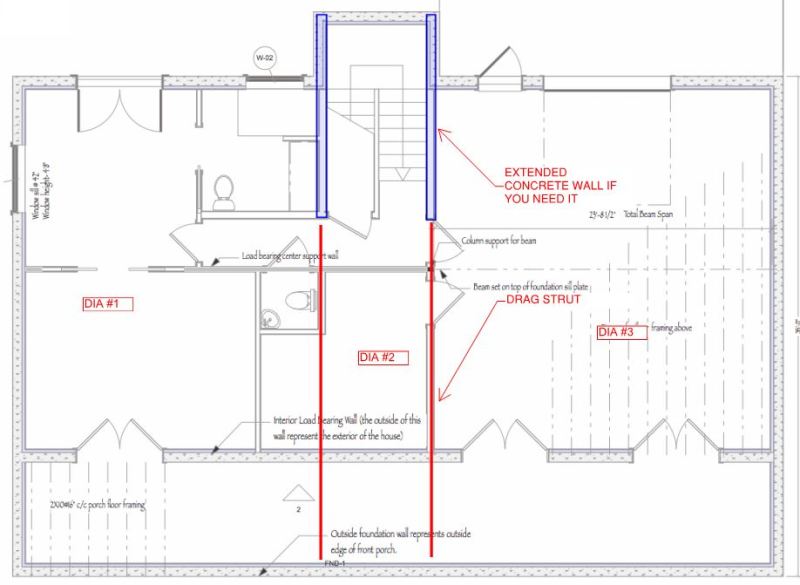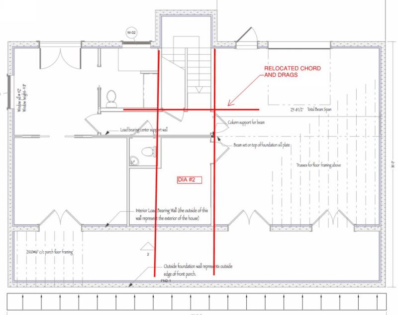 Might be better to use the wall to the left of the powder room for a single drag strut. Would not have an uplift problem and will be easier to connect to. That still does not solve the interruption of my diaphragm tension chord by the stairwell but i have never seen that be an issue in practice anyway.