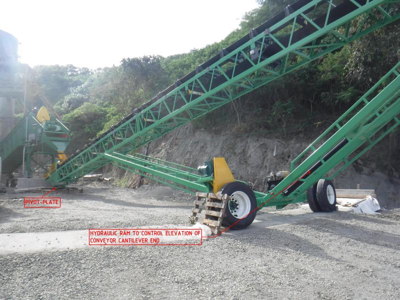 I was involved with the recent installation of a 36" (wide) x 100'+ (long) radial stacker for manufactured sand - and there was no counterweight, however it was a permanent installation, and the tail-end supported on a huge 5' x 6' base plate with a greased pivot plate.